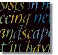 Paint part of a color wheel on black paper; add white paint gradually to a color in a line of lettering. Change smoothly from one color to another. Work with the double primary palette to make clean colors and also revel in those dirty shades that come from playing off the grid. Develop confidence in the use of color. If you've never used paint in your pens, here's the chance to begin. If you are experienced in using paint, now is the time to stretch yourself by exploring the balance between color, white paint, and water.